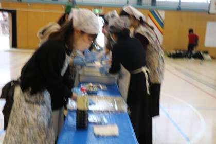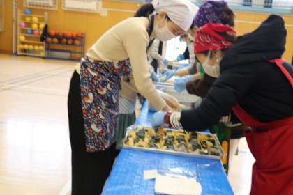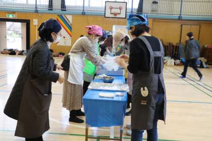 体育館では、お母さんたちが持ち分けをしてくれています。しょうゆ・のりときなこの二種類です。