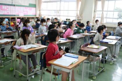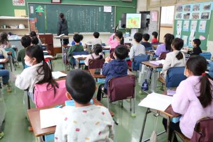 2年生国語「お話の作者になろう」の様子です。挿絵から登場人物の名前を考えたり、何をやっているところか考えたり、楽しそうです。