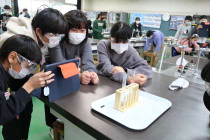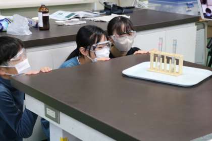 6年生理科「水溶液」の学習の様子です。今日はスチールウールとアルミニウム箔が薄い塩酸の中でどのように反応するかしないか観察します。安全に気を付けながら落ち着いて実験に取り組んでいます。