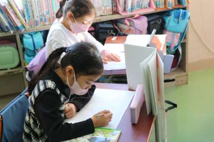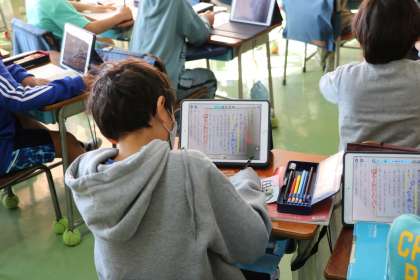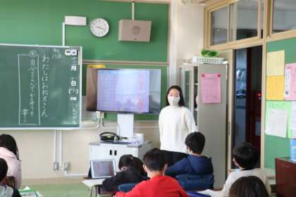 2年生の国語の授業の様子です。今日は「わたしはおねえさん」を読んで自分と比べて感想を書こうというめあての授業でした。教科書の例を参考にして、それぞれ感想文を原稿用紙に書いていました。