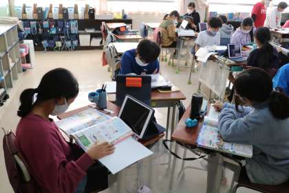 6年生の社会の授業の様子です。ペリーの来航によって日本がどう変わったのかを資料集やタブレットを使って調べていました。歴史の学習もだんだんと現在に近づいてきています。