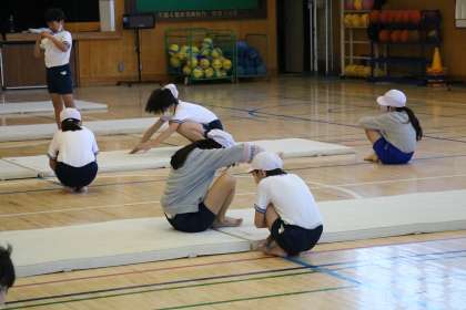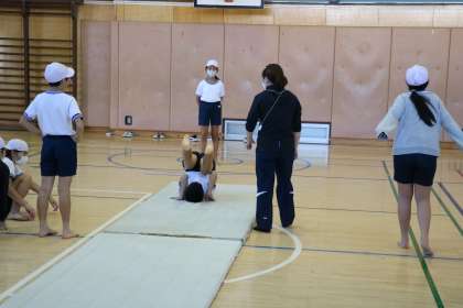 6年生の体育の授業の様子です。マット運動を行っていました。前転、後転といった基本の動きを丁寧に確認していました。友達同士で動きを確認しならが取り組んでいました。
