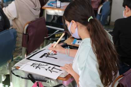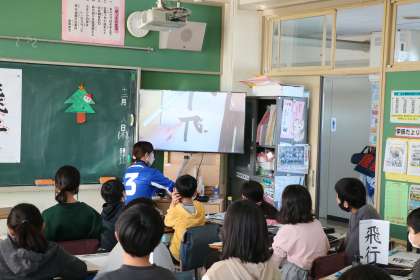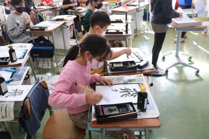 5年生の書写の授業の様子です。「飛行」という字を書いていました。先生が書き方の手本を大型テレビで示すことで、書き方のコツがつかみやすかったようです。どの子も集中して練習に取り組んでいました。