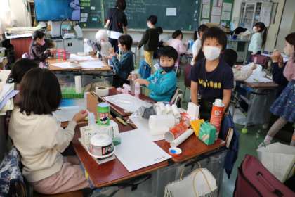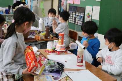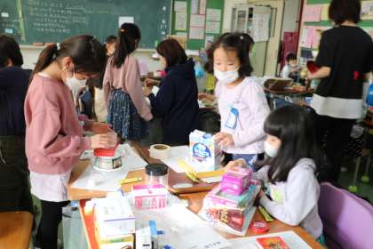 1年生図工・みらいの〜を作っています。家から持ってきた箱やパックなどをあれこれ組み替えたり積み直したりしながらイメージを膨らませています。