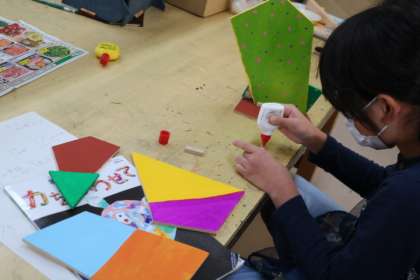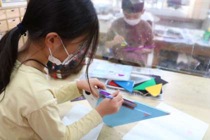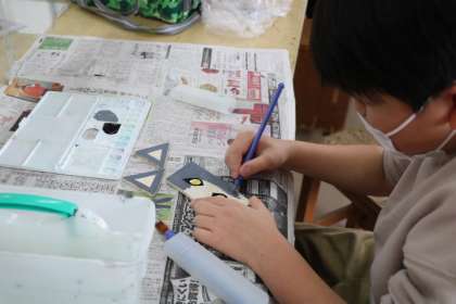 4年生図工・「作って使って楽しんで」の様子です。色塗りや組み立ての順序を考えながら、切った板の形を活かして作品にしています。ヒートンやコルクシートなどを付けて楽しく使えるように工夫します。
