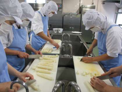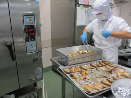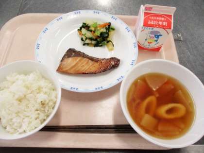 きりたんぽ汁は秋田県の郷土料理です。何人かのこどもたちに「この白いのはなんですか?」「ちくわですか?」と聞かれたので、「ごはんをつぶして焼いたものなんですよ。」ときりたんぽについてお話しました。冬が旬のぶりはあぶらがのっておいしく、残さいもほとんどありませんでした。