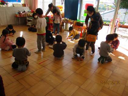 はな組では、今日、一人一人に引きゴマが配られました。コマの持ち手近くの芯に、ぐるぐるとタコ糸を巻き、持ち手を持ちながらぐっと糸を引いて、コマを回します。