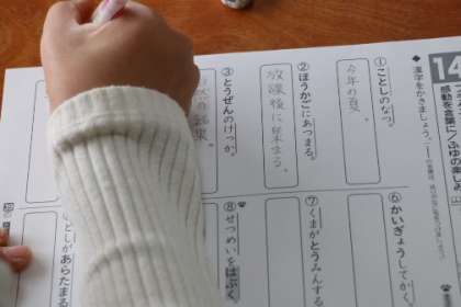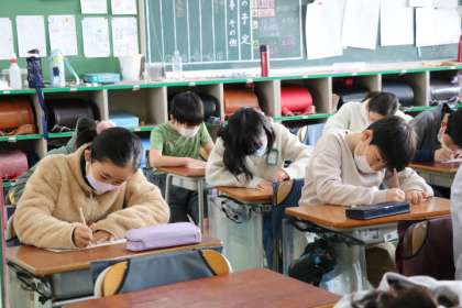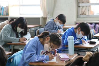 4年生国語漢字テストの様子です。今学期最後の漢字小テストです。止め、はね、はらいに気を付けて丁寧に書いています。