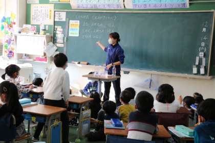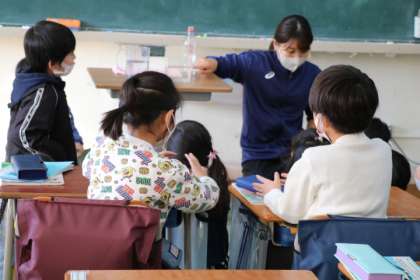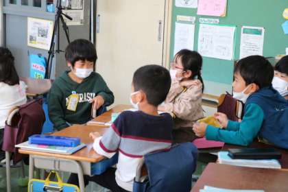 1年生算数「くらべかた」の学習の様子です。今日は水のかさを直接比較、間接比較などで比べています。先生が「気付いたことを、お友達と話し合ってみましょう。」と言うと、それぞれの意見をちゃんと聞いたり伝えたりしています。