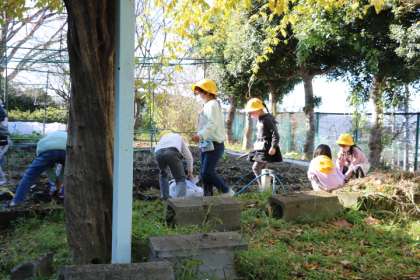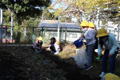 1年生生活科の様子です。畑でアサガオの鉢から土を出しています。軽くなった植木鉢をもって、校庭に行きます。さあ、何をするのでしょうか。
