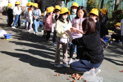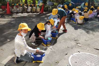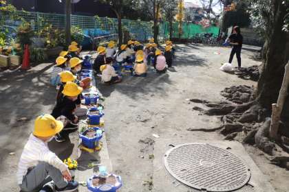 今日は、アサガオの植木鉢に球根3つとビオラの苗を植えます。先生の話を真剣に聞いて、植え方を確認します。アサガオの種を植えたときの様子を思い出し、成長を感じます。