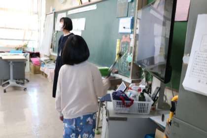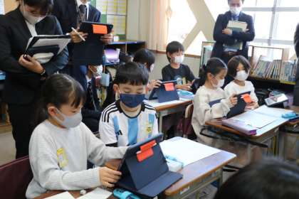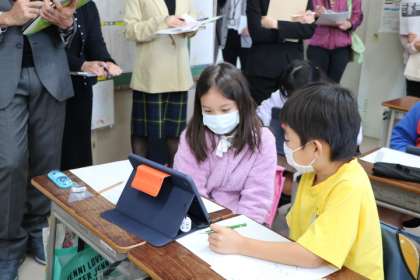 自分の描いた三角形について隣の友達と、どんな三角形を描いたか、どうやってそれを調べたかなど伝え合います。意欲的に学び合ったり、発言したりする学習の様子を参観した先生たちも感心して見ていました。
