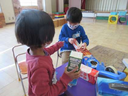 何ができるのかよく見てみると、ギターのように弦を弾いて鳴らす楽器を作っています。数日前から、様々な楽器が遊戯室に並び、音を鳴らしたり、曲に合わせてみたりして楽しんでいたので、さらに知っている楽器を作ってみたくなったのでしょうか。弦の楽器を作っていることは同じでも、箱のつなぎ方、形、弦のつけ方など一人一人違っています。自分で考えて工夫している様子です。