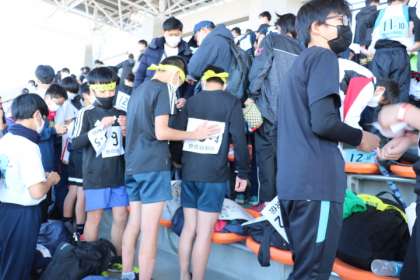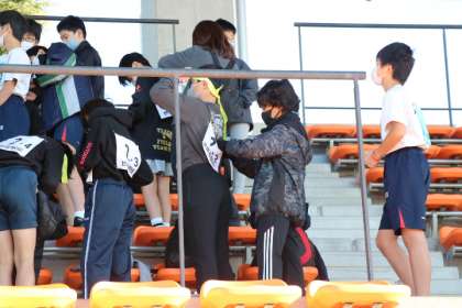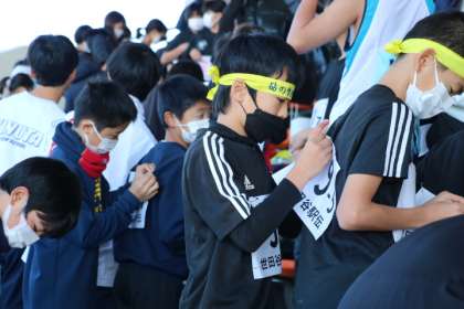 小学生も中学生も互いに協力してゼッケンを付けるこの時間が、私は好きです。それぞれのチームの一体感が深まるのです。