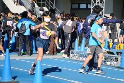 男子も女子も一生懸命です。走順を待つ子から、スタンドの上から大きな声援が飛びます。