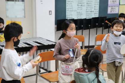 1年生音楽の様子です。今日は音楽室で合奏の発表会です。