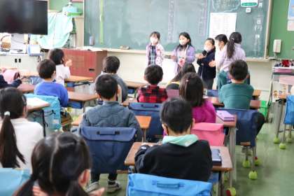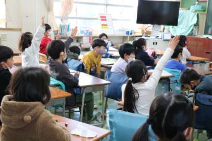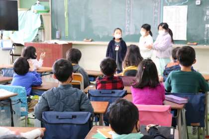 1年生、こちらのクラスは、冬休みのことを前に出て一人ひとりスピーチしています。他の子たちは真剣に聞き、質問したいことがあればスピーチの最後に手を挙げて聞きます。家で練習してきた子もいるようですが、どの子もとても上手に楽しかったことや、ハプニングなどを話していました。スピーチの終わりに自然と温かい拍手があり、安心して聞いてもらえる雰囲気が嬉しいです。
