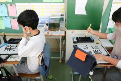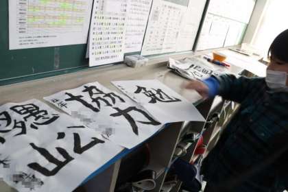 5年生が、3学期の抱負を半紙に書いています。それぞれ自分の思いを文字や言葉に込めているのです。その意味を聞くのがまた楽しくて。真剣に書いているのを邪魔しないように聞いていました。