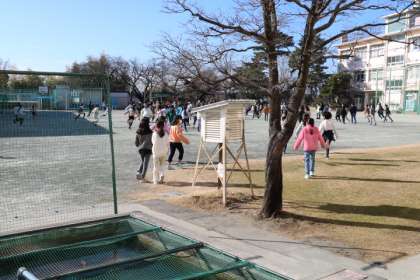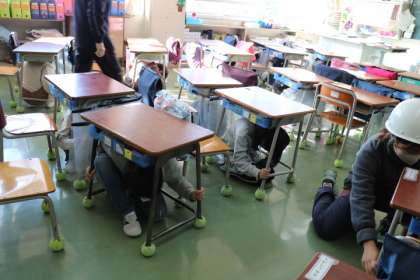 今日は休み時間中の避難訓練です。地震の後給食室から火が出た想定です。いろいろな情報を整理しながら行動しなければなりません。