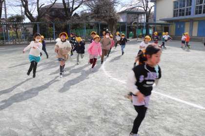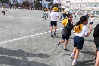 2年生は、外側の持久走のコースを走る子が多いです。カメラにピースをしたり手を振ったり、少し余裕のお兄さんお姉さんたち。