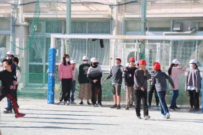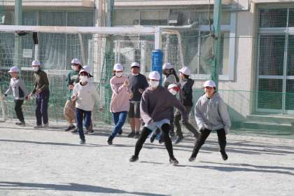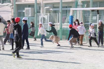 サッカーゴールのところにドロケイで捕まった仲間がたまっています。仲間が助けに来て次々タッチしてくれたのでくもの子を散らすように逃げていきます。また追いかけっこの始まりです。