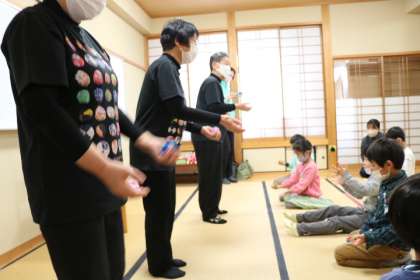 今日は「東京・お手玉の会」の方が3名いらっしゃり、1年生にお手玉を教えてくださいました。