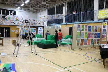 写真は昨日19時ころの体育館の様子です。先生たちで作品を搬入できるばっかりに整えています。どうやって台を置いたら作品が見やすくなるか、どんな順番で並べたらよりすてきに見えるかあれこれ相談しながら作業しています。遅い時間ですがなんだかとっても楽しそうです。