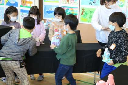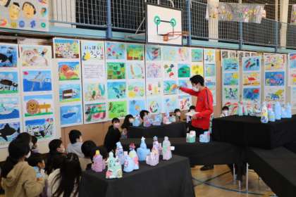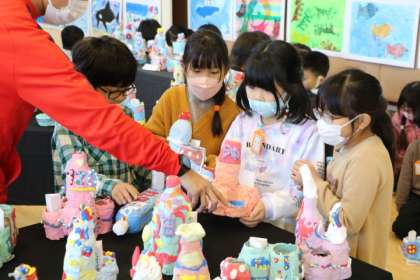 2年生の搬入の様子です。「わたしのペン立て」という作品です。見に来る人が見やすい位置を確かめながら展示していました。