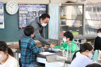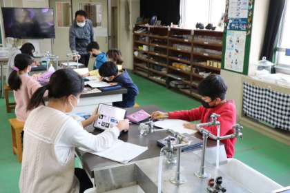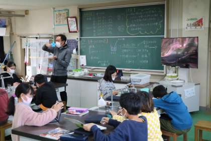 5年生の理科の授業の様子です。食塩とミョウバンを水に溶かす実験の結果について考察していました。実験結果から食塩とミョウバンは水に溶ける量に差があることが分かったようです。さらに水に溶かすためにはどうしたらいいかも考えていました。