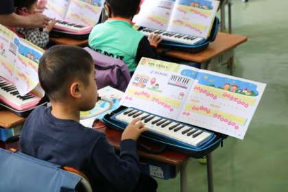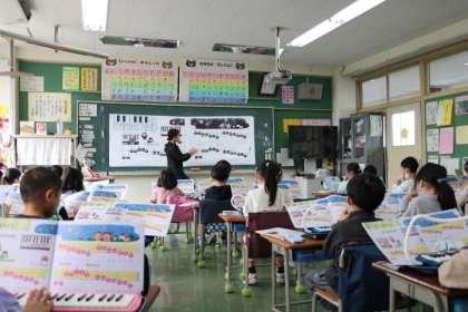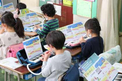 1年生の音楽の授業の様子です。鍵盤ハーモニカで「きらきらぼし」を合奏していました。みんなで音を合わせることができていました。この1年間で指使いがずいぶん上達しました。