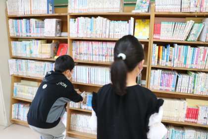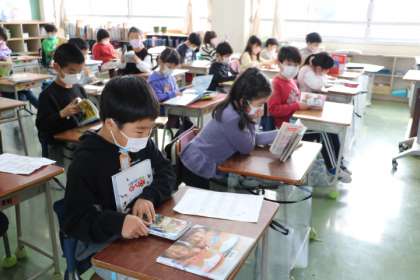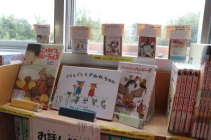 今週「お話給食」週間ということで、毎日絵本にちなんだまたは絵本に出てくるメニューです。図書室前にはこのようなコーナーもあり、興味をもった子は手に取って読むこともできます。子どもたち図書の時間は大好きのようです。思い思いの本を選び読みふけっています。写真は2年生の様子です。