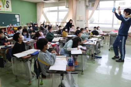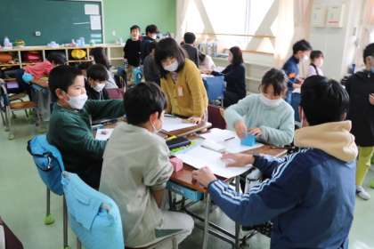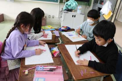 2年生算数「立体図形」の学習の様子です。面の数、形を確かめています。面を写し取ってみると気が付くことがたくさんあるようです。