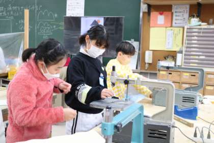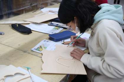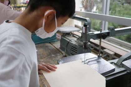 5年生図工「ズラシックパーク」の様子です。ベニヤ板を電動糸のこぎりで切り、ベニヤ板のパーツを手前・中・奥と意識的にずらして一つの世界を作っていく作品です。