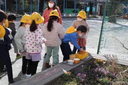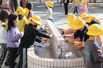 ランランランが終わったとたん、1年生が生活科の学習で何か活動を始めました。何をしているのかと思えば・・・「氷作り」です。今朝の寒さと友達が持ってくる氷に興味をもったのですね。担任の先生に容器をお借りして、水をはったり、葉っぱや花を浮かべたりしました。どこに置けば氷になるか?自分で考えて置いていました。明日が楽しみです。