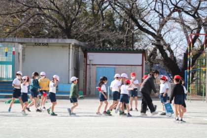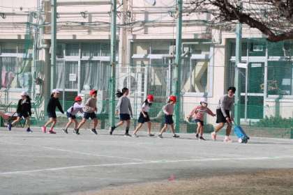 2年生体育「ボールけりあそび」の準備の様子です。線を引く先生の後をついて歩く子どもたちがあまりにも可愛くてカメラを向けてしまいました。準備ができたので一生懸命ボールけりを楽しみましょう!