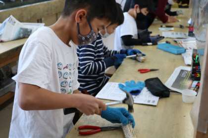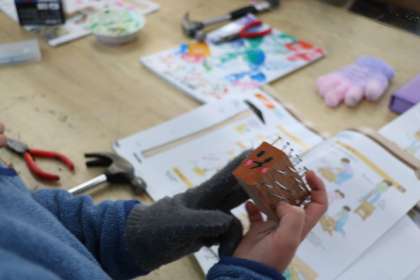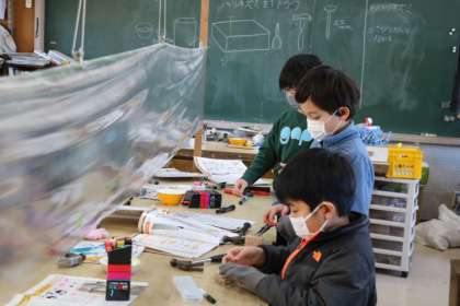 3年生図工「トントンこびとさん」の様子です。木の端材にくぎを打ち、こびとさんの顔の表情や手足を作ります。