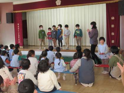 最後に、司会をするときのように立ってみよう!ということになり、はな組の子どもたちがステージの前に並んで立ちました。少し緊張した面持ちでしたが、姿勢よく前を見て立つことができました。それを見ていたほし組の子どもたちから「だんだんほし組に近づいてきたね」との声が掛かり、嬉しそうでした。