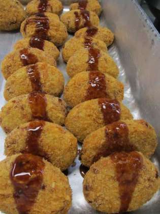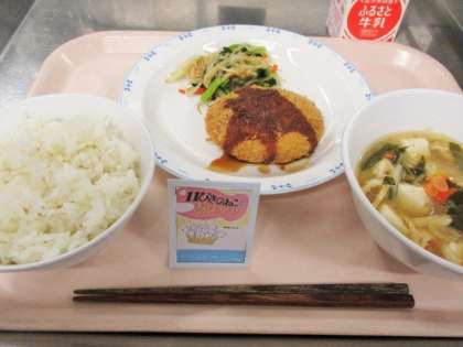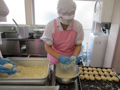 今日は「11ぴきのねことあほうどり」という本に出てくるコロッケをイメージした給食です。約150個のじゃがいもを使って、材料からひとつひとつ給食室で手作りしました。
