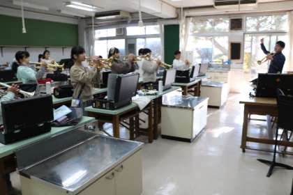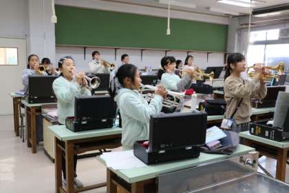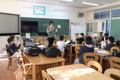今日はプロの音楽家の方を講師にお招きし、5年生鼓笛演奏・フラッグ演技の指導をしていただきました。