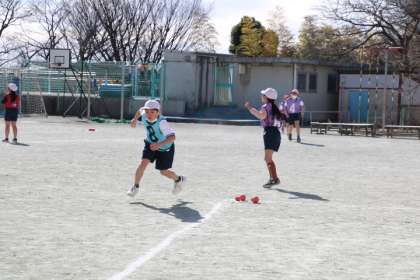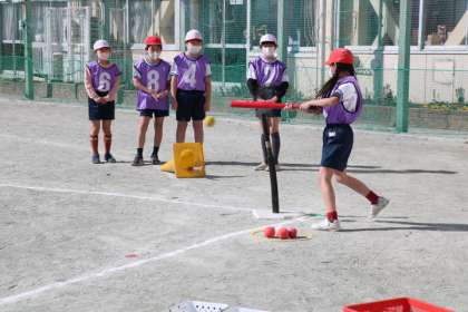 4年生「ベースボール型ゲーム」の様子です。ルールが複雑なので、詳細はお子さんに聞いてください。アウトゾーンがあり、ボールを取った子とそのほかの守備の子みんながゾーンに入るとアウトになります。バッティングの合間に、体の向きこうだよ、バットの振り方はこうだよ、よくボールみてね・・・とアドバイスの声が飛びます。