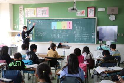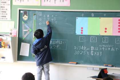 2年生の算数の授業の様子です。千の位の数について学習していました。一の位から千の位までにどんな数を入れればいいか考えて数を表していました。練習問題にも意欲的に取り組んでいました。