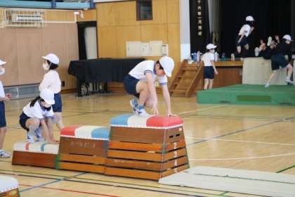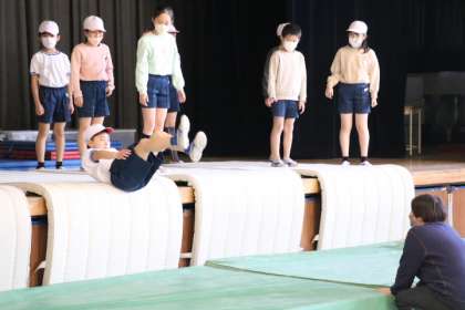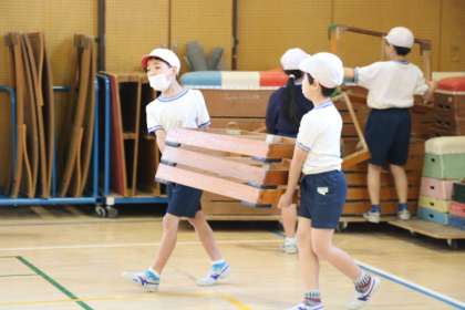 4年生の体育の授業の様子です。マットと跳び箱を使った運動に取り組んでいました。ステージの高さを使った前転の練習は、台上前転の着地にもつながる練習です。みんな楽しそうに取り組んでいました。準備や片付けも協力してできていました。