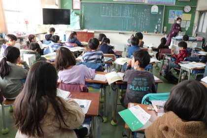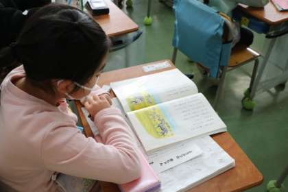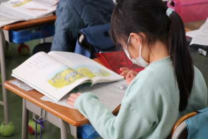 1年生国語「どうぶつのあかちゃん」の様子です。長い文章を何度も読み返して、ワークシートの設問に当てはまる個所を抜き出して書いています。
