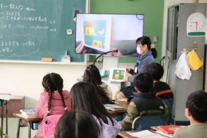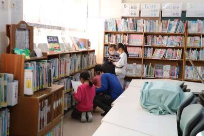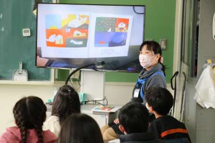 図書の時間の様子です。図書の時間は司書の先生に最初絵本を読み聞かせいただいてから、自分お好きな本を選びます。写真は2年生に読んでいただいた「おとなりさん」という本です。