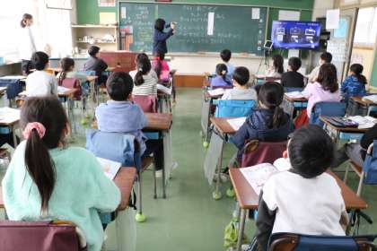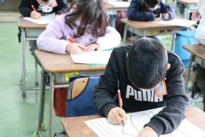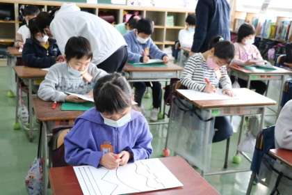 みんな真剣に、慎重にカッターを使い画用紙を切っています。紙を回転させたり、カッターマットの真ん中に切る部分を置けるように紙をずらしたり、作業も丁寧です。