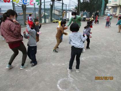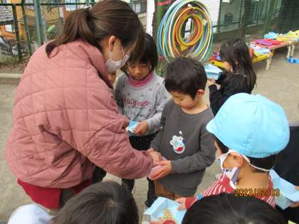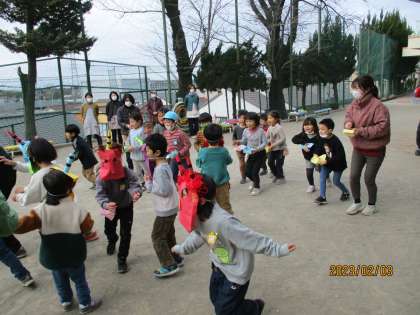 豆まきはさすが年長さん。鬼の逃げ足も速いし、追いかける方も速い。「こっちだよ〜!」などの呼びかけやかけひきも見られ、互いに楽しんでいるのが分かります。