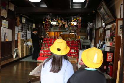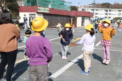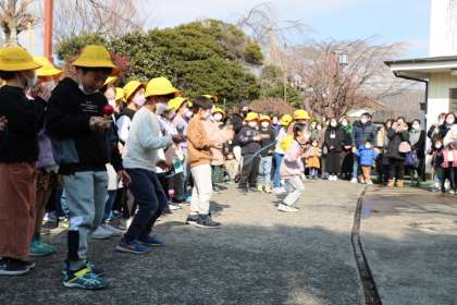 たくさん遊んだり、お雛様を見たり楽しんだ後に、お礼に「あんたがたどこさ」の歌に合わせてけん玉や縄跳びを披露しました。