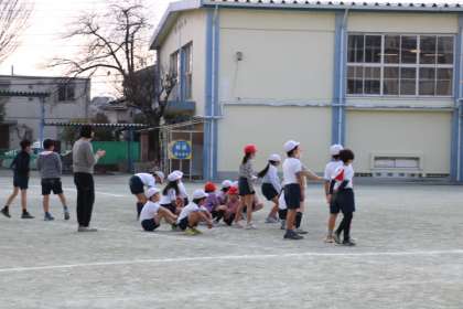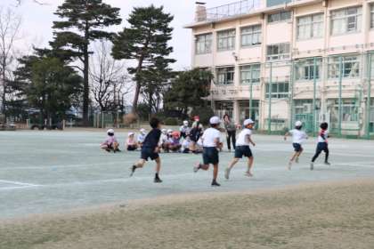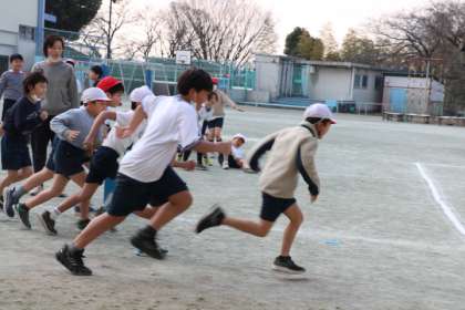 3年生、こちらの学級は持久走の練習です。1周ごとのタイムから、自分のペースを確認しながら走れるよう友達が記録を取ってくれます。
