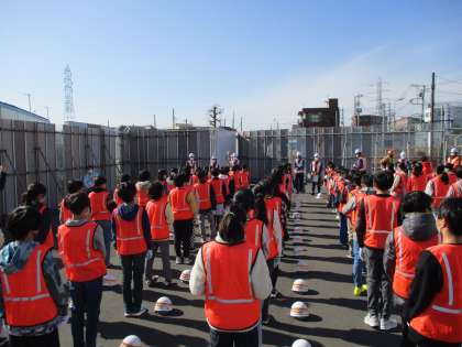 5年生が外環道見学に行ってきました。現場には学校から徒歩10分くらいで到着しました。たくさんの職員のみなさんに迎えてもらいました。