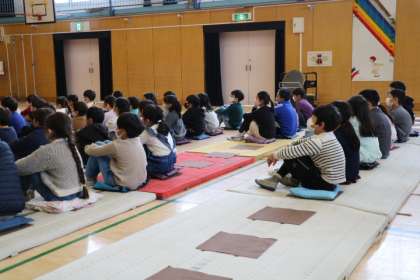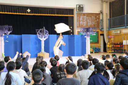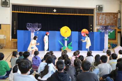 東京都の「子供を笑顔にするプロジェクト」の一環で、今日は1・2年生の児童が劇団風の子の「おばけたんぽぽ」という劇を鑑賞しました。生きていくことの喜びや、生きていくことへの希望をテーマの劇でした。コミカルな演技や楽しい歌をみんな笑顔で鑑賞できました。
